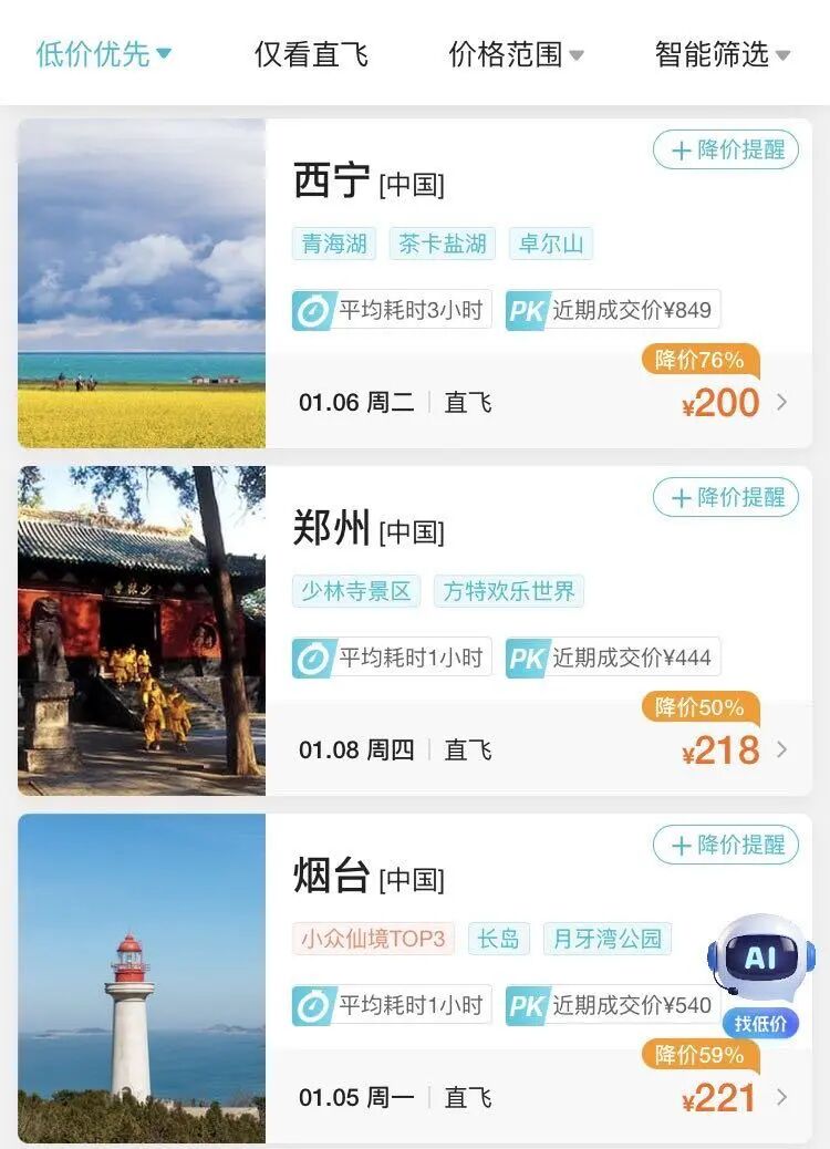 此外,近期杭州飞西宁、郑州、烟台、深圳等地智慧财讯,经济舱机票价格最低都是200元出头(不含税)。
