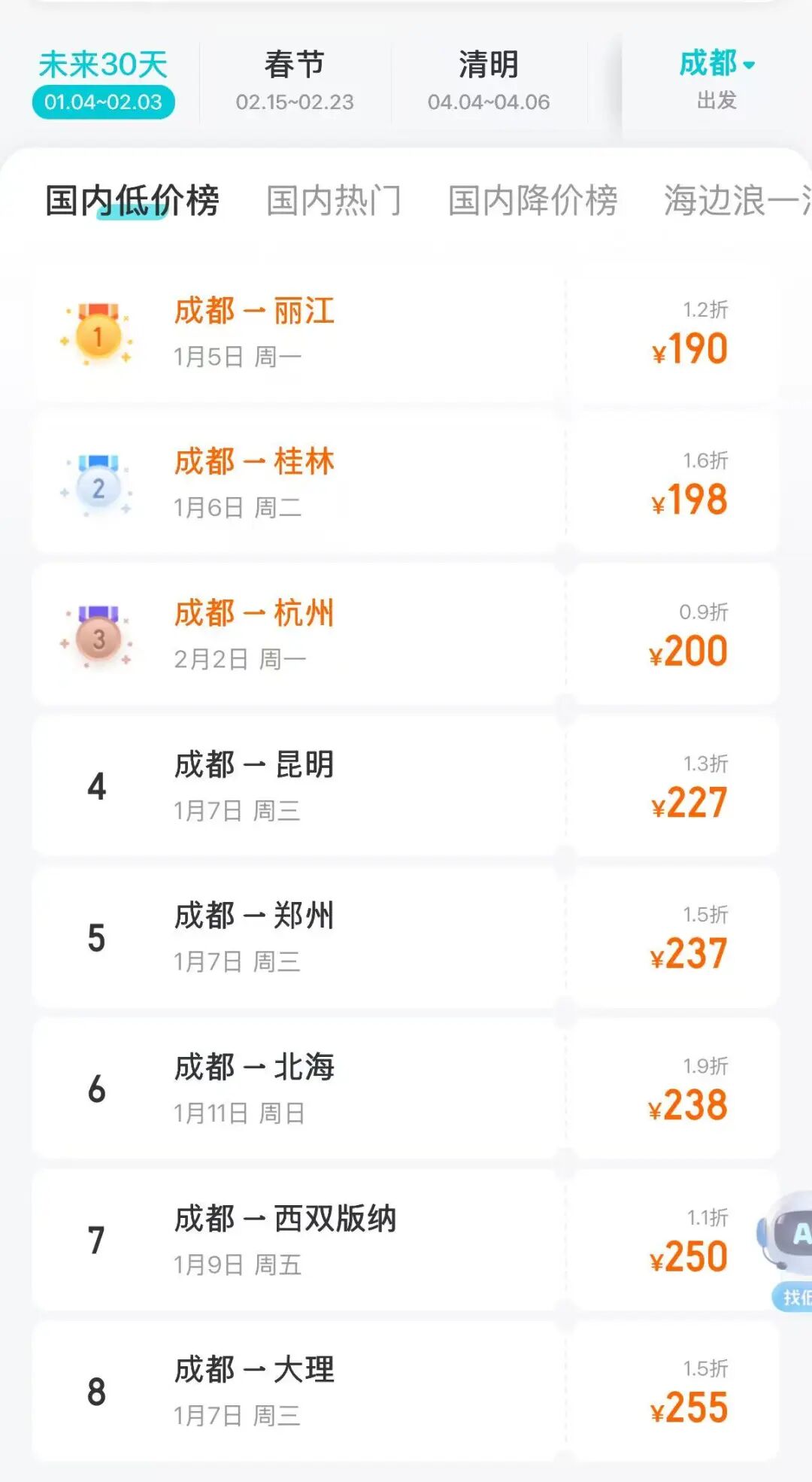 成都飞丽江最低190元,1.2折;成都飞桂林最低198元,1.6折;成都飞杭州最低200元,0.9折;成都飞昆明最低227元,1.3折;成都飞郑州最低237元,1.5折;成都飞北海最低238元,1.9折;成都飞西双版纳最低250元,1.1折;成都飞大理最低255元,1.5折。