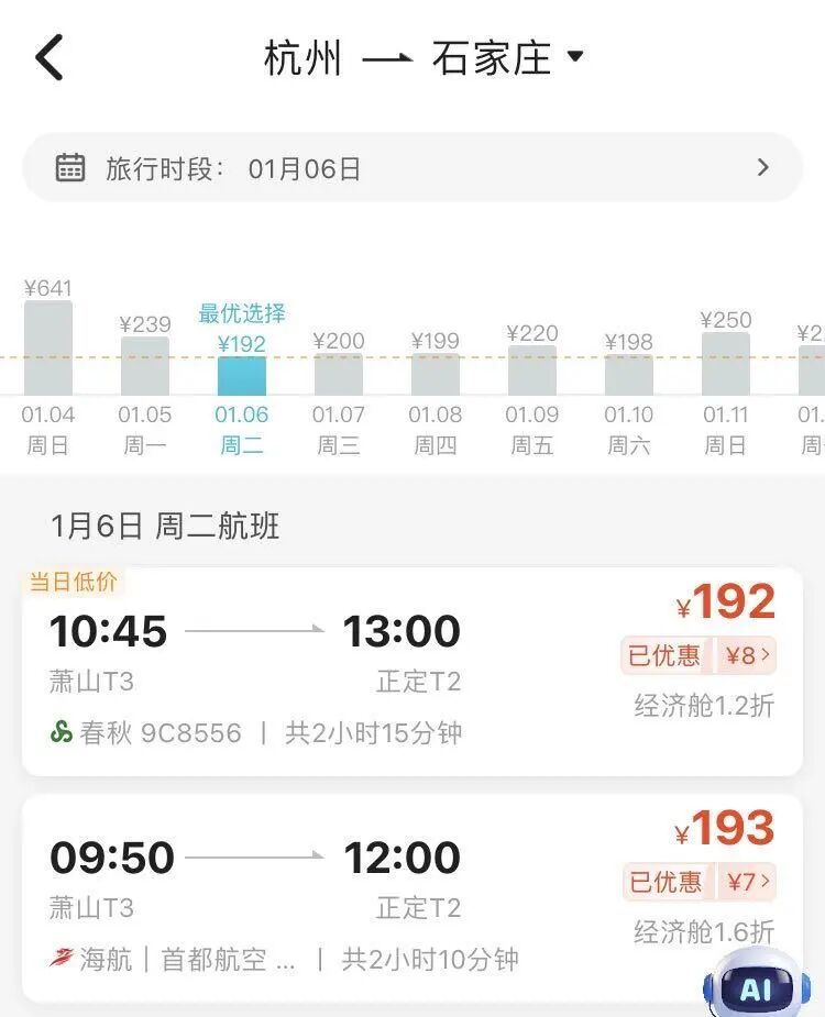 比如,1月6日,杭州飞石家庄到经济舱最低票价为192元(不含税),相当于打1.2折;1月5日,杭州到揭阳经济舱最低票价也是192元(不含税),相当于打1.6折。