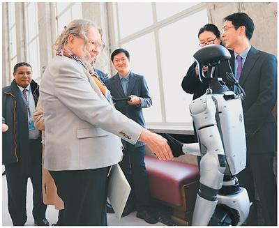图为2025年11月,联合国日内瓦办事处总干事瓦罗瓦娅(前)在“人工智能团结共治”高级别对话会前与机器人握手互动。新华社记者连漪摄
